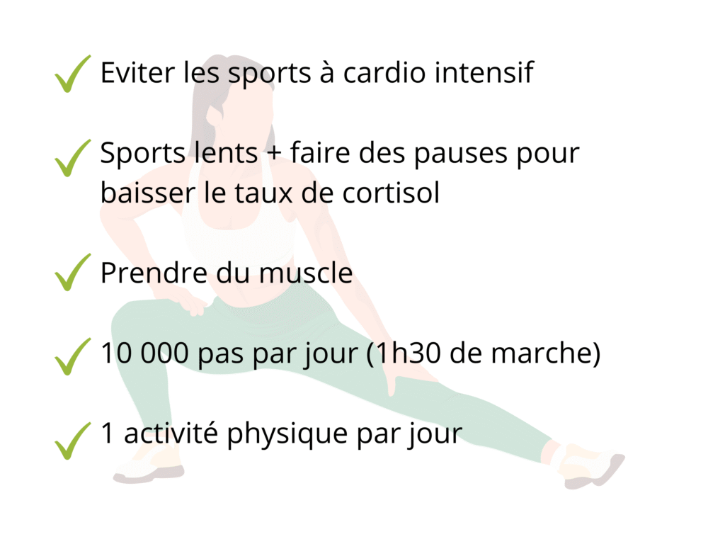 La pratique des sports cardio où l’effort est intense n’est pas l’idéale. L’intensité du sport va faire augmenter votre niveau de cortisol, stresser vos hormones et augmenter la production de testostérone, ce qui alimentera vos symptômes.