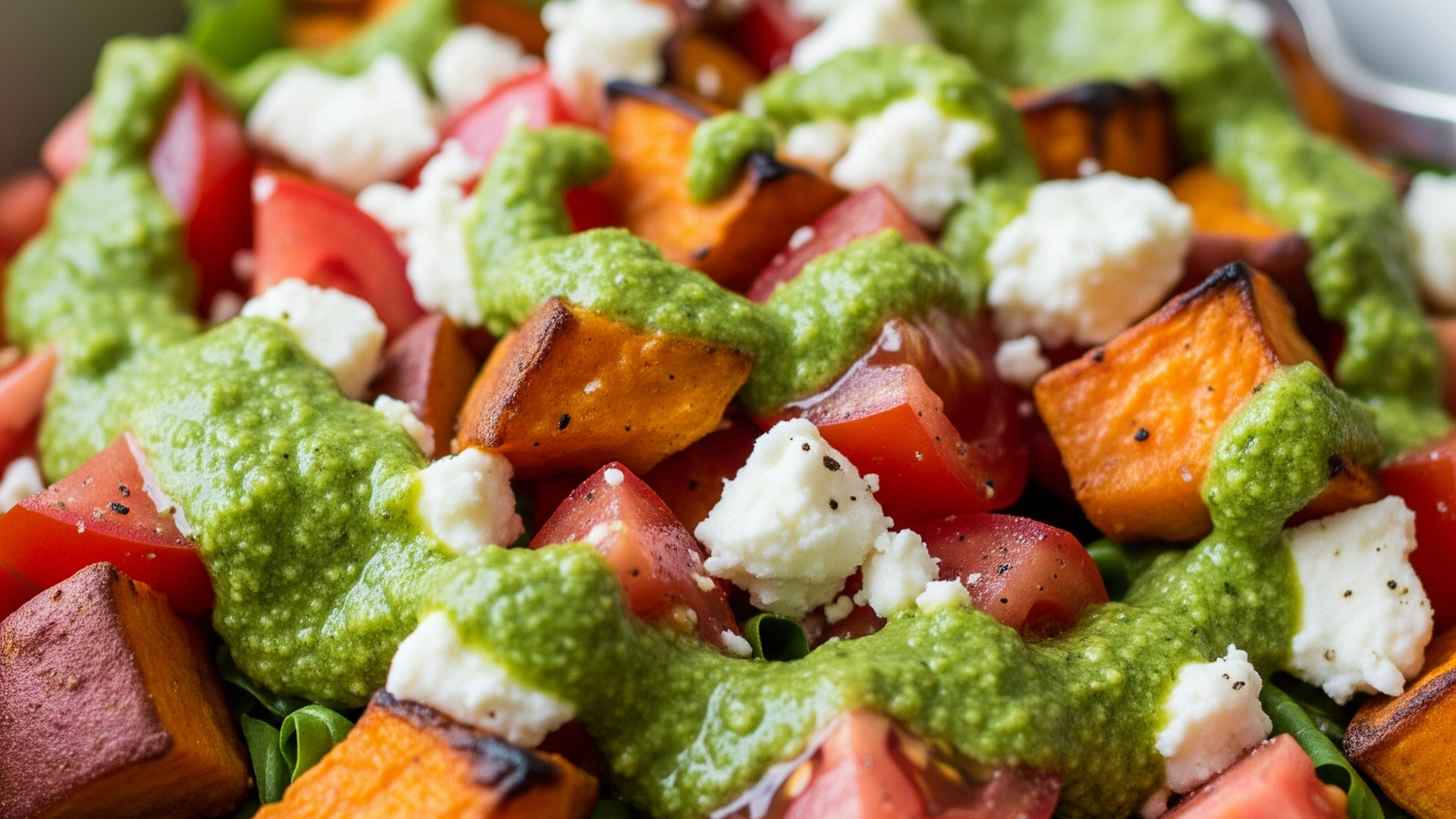 - Mélanger les patates douce froides, les tomates, la salade coupée finement, la sauce au basilic. Émietter la féta par dessus. Mélanger, et c’est prêt !